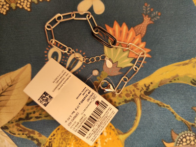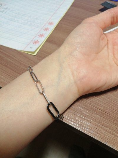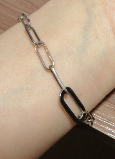 В реальности браслет не такой крупный. Перекручивается декоративный элемент с эмалью, лучше бы эмаль нанесли с двух сторон, тогда бы перекручивание было не принципиально. Длина браслета рассчитывается от замка до крайнего кольца. Если хотите, чтобы браслет сидел на руке с небольшой цепочкой, висящей после замочка, рассчитывайте обхват запястья от замка до основного колечка крепления, после которого ещё останется несколько звеньев декоративной цепочки.