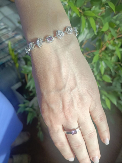 Мне этот браслет подошёл. У меня есть серьги сиреневые с прозрачными фианитами, с ними я ношу кольцо только с прозрачными фианитами (подходит стиль). Браслет тоже сочетается.
