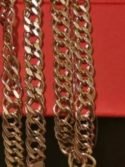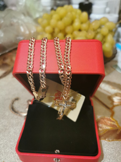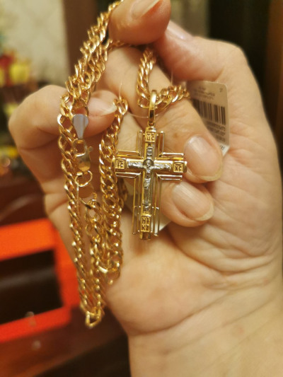 Цепочка плетения двойной ромб, 55см в длину и 5,7 мм в ширину просто сияет своими гранями. Смотрится хорошо, очень красивый подарок к юбилею. После покупки аккуратно и празднично упаковали в коробочку. Советовала приятная девушка Эльвира, она же и предложила крестик в дополнение к цепочке 👍. Подарок юбиляру понравился😊.
