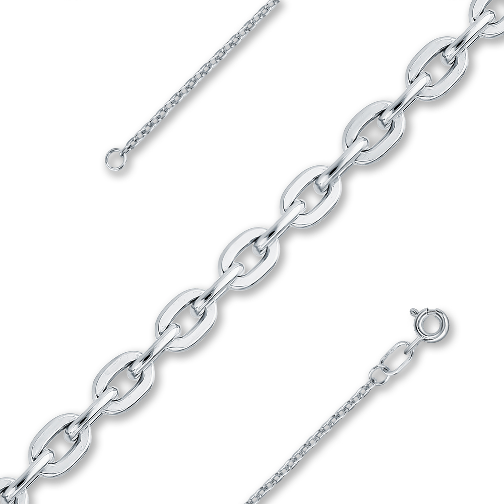 Якорное плетение - настолько надежное, что можно "вешать якорь". Звенья расположены под прямым углом друг к другу, от чего цепь получается объемной и крепкой. Плетение универсально, подходит и женщинам, и мужчинам. Классическая якорная цепь состоит из звеньев продолговатой формы с закругленными концами. Для усиления блеска края обрабатывают алмазной гранью.