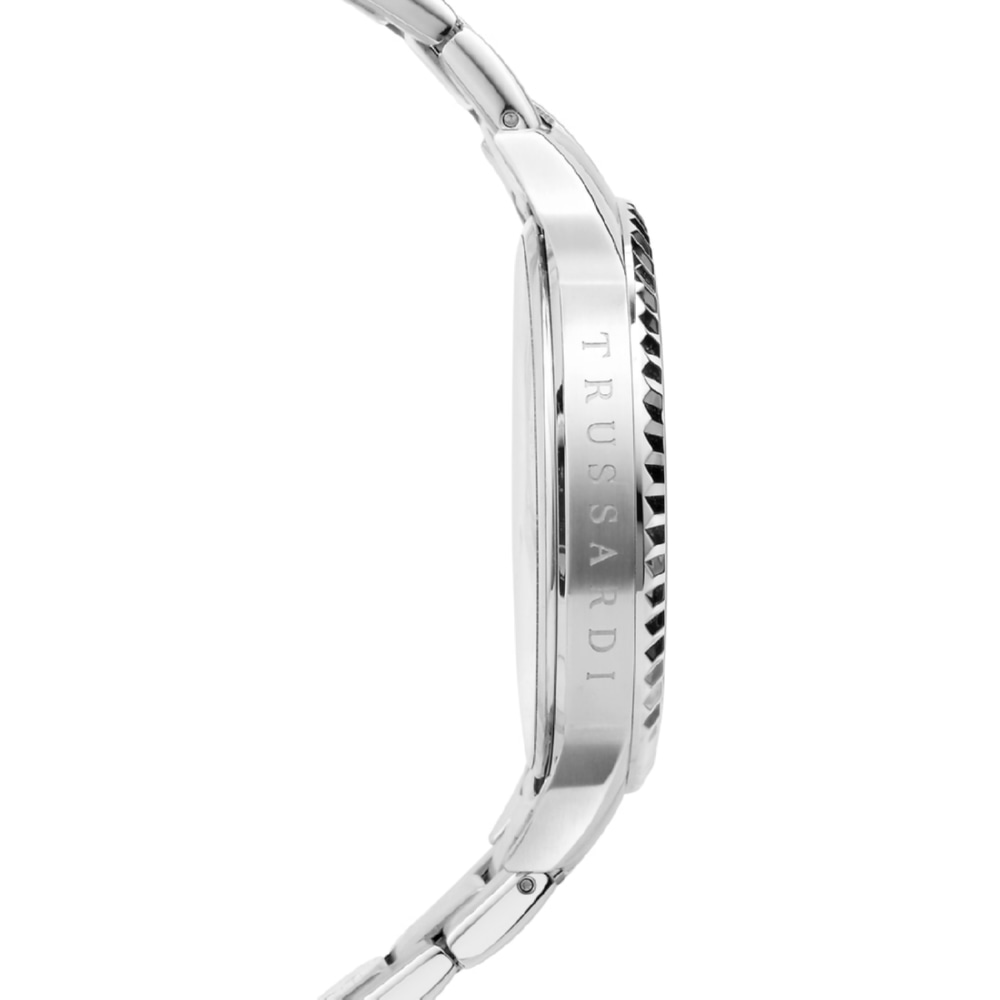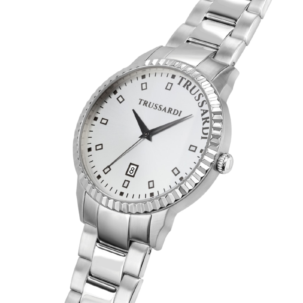 • Брендовые акценты в современном дизайне часов Trussardi R2453141004 из коллекции T-BENT создают особый и запоминающийся образ. В этой модели все внимание приковано к деталям: зубчатый безель, четкие линии стрелок и индексов, символ бренда Greyhound на противовесе секундной стрелки. В часах установлен японский кварцевый механизм. Окошко даты. Прочное минеральное стекло. Диаметр корпуса – 43 мм. Водостойкость 5 АТМ (мытье рук, дождь). Часы выполнены из нержавеющей стали 316L. Браслет с раскладывающейся застежкой (клипса). Гарантия 2 года. Страна производства - Италия. В комплекте с часами: индивидуальная упаковка, паспорт, инструкция, гарантийный талон. Итальянский модный бренд с вековой историей и традициями. Компания была основана Данте Труссарди в 1911 году в Бергамо как небольшая фабрика по производству дорогих роскошных кожаных перчаток. За несколько лет его высококачественное сырье и постоянное совершенствование методов обработки кожи сделали Trussardi одной из самых известных фирм на международном рынке аксессуаров, а Данте Труссарди стал официальным поставщиком британской королевской семьи.