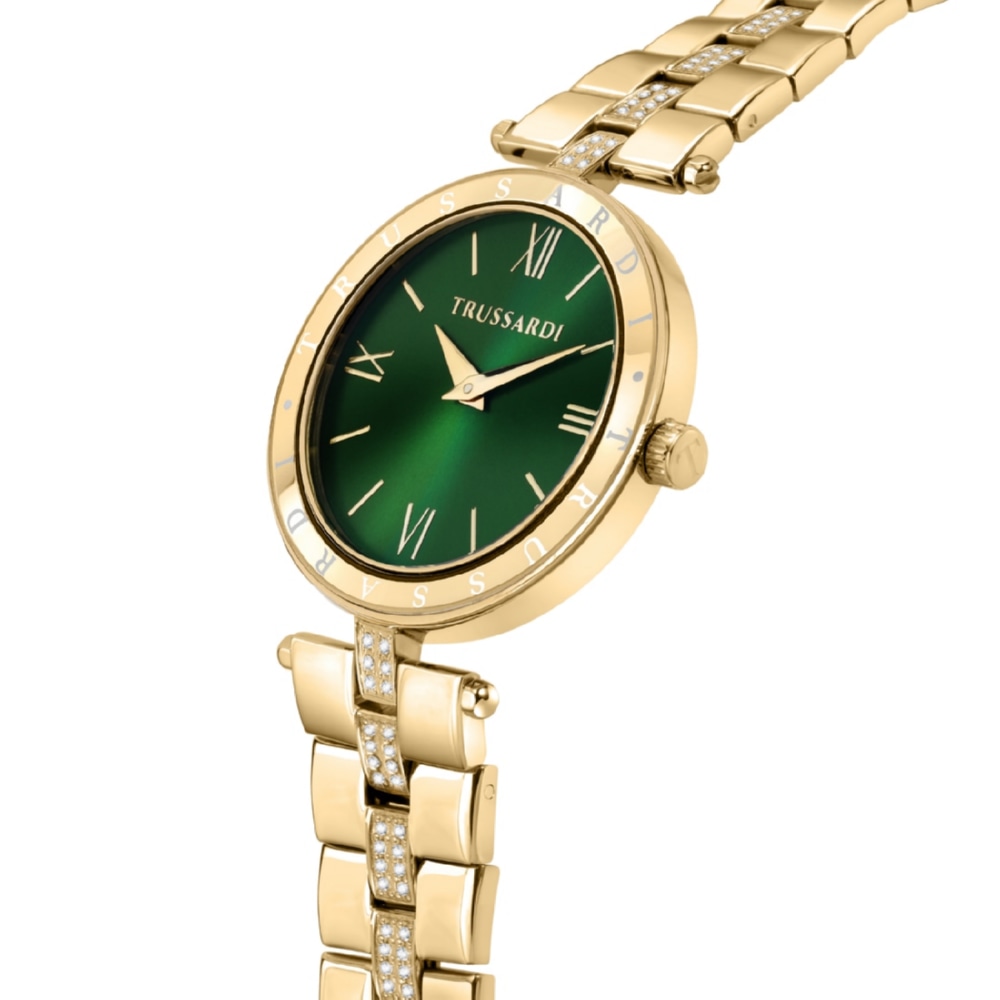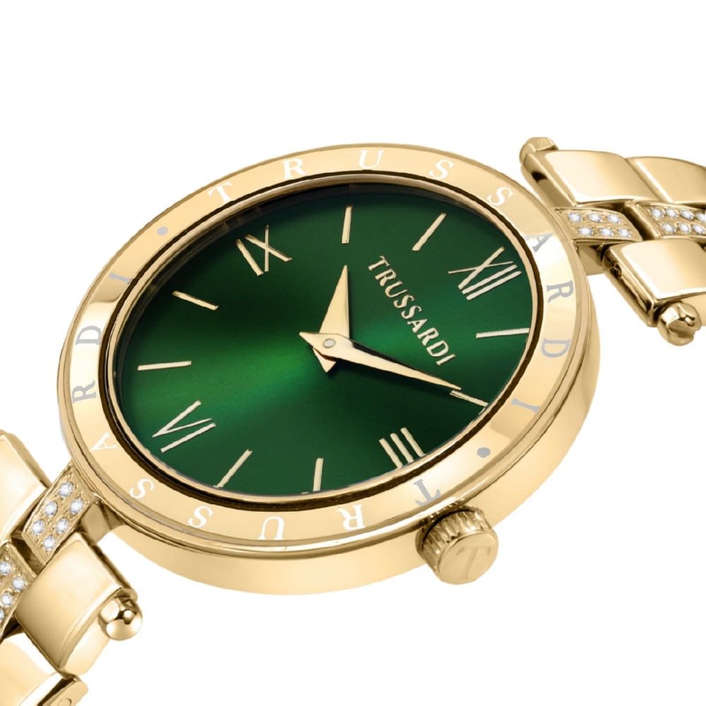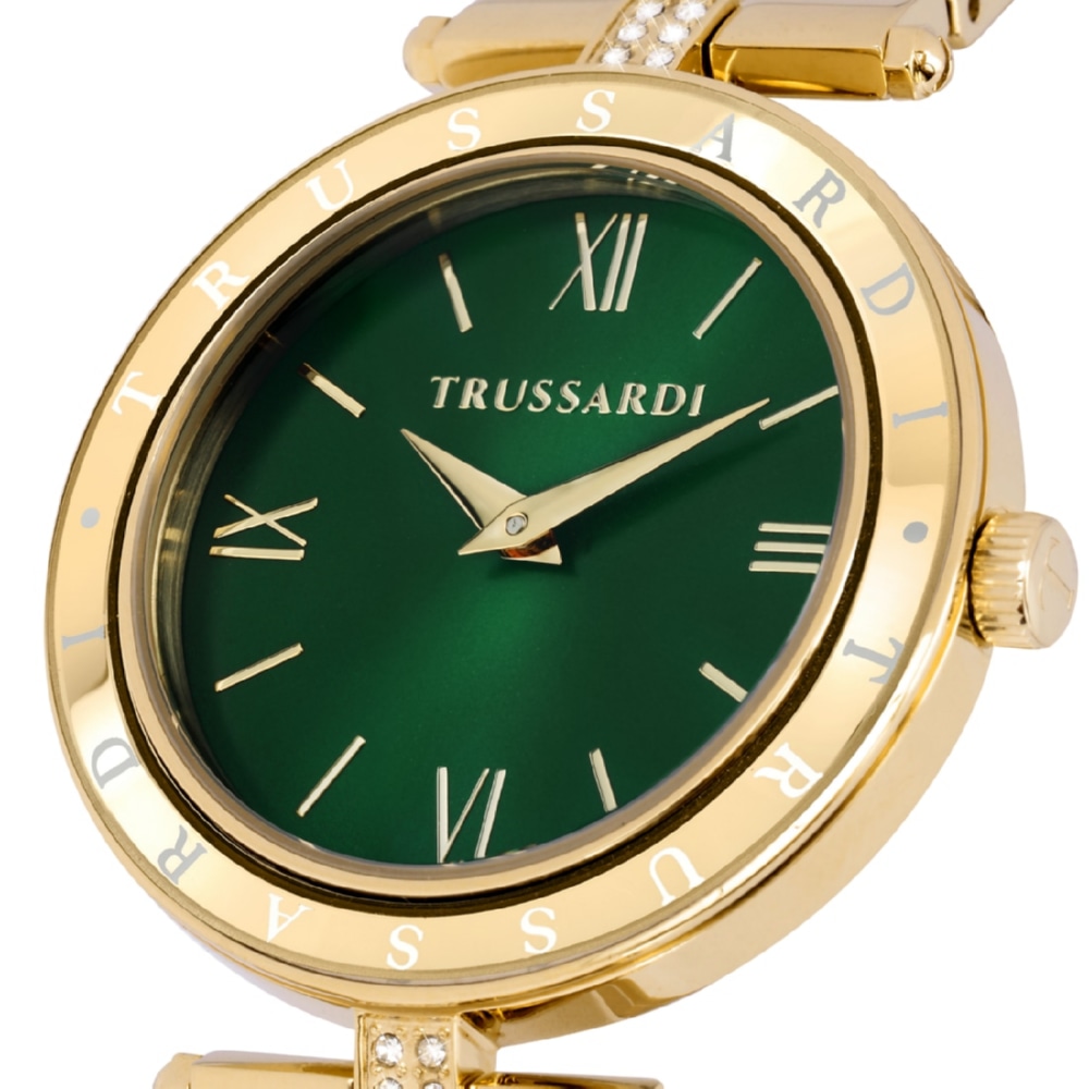 Брендовые акценты в современном дизайне часов Trussardi R2453145511 из коллекции T-Shiny создают особый и запоминающийся образ. Элегантный корпус с центральным кремпением и дорожкой кристаллов, уходящей в глубину браслета. В часах установлен японский кварцевый механизм. Прочное минеральное стекло. Диаметр корпуса – 34 мм. Водостойкость 5 АТМ (мытье рук, дождь). Часы выполнены из нержавеющей стали 316L. Браслет с раскладывающейся застежкой (клипса). Гарантия 2 года. Страна производства - Италия. В комплекте с часами: индивидуальная упаковка, паспорт, инструкция, гарантийный талон. Итальянский модный бренд с вековой историей и традициями. Компания была основана Данте Труссарди в 1911 году в Бергамо как небольшая фабрика по производству дорогих роскошных кожаных перчаток. За несколько лет его высококачественное сырье и постоянное совершенствование методов обработки кожи сделали Trussardi одной из самых известных фирм на международном рынке аксессуаров, а Данте Труссарди стал официальным поставщиком британской королевской семьи.