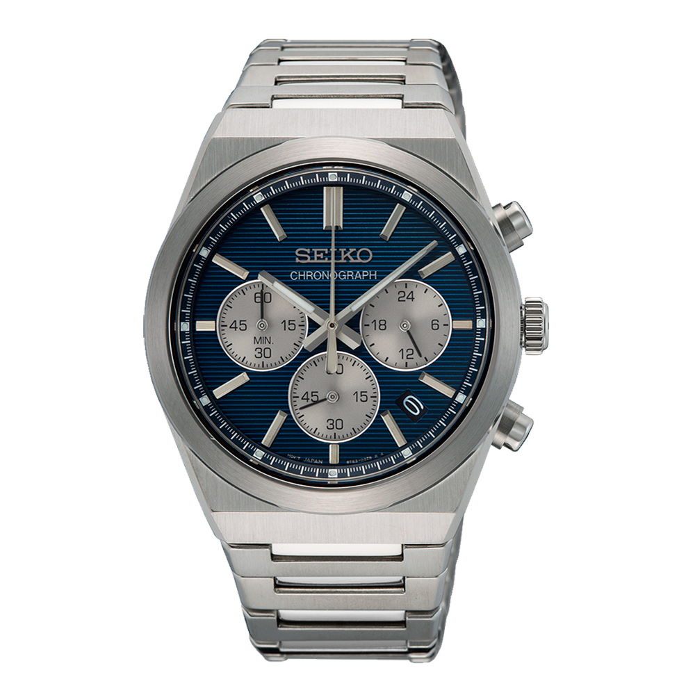 Мужские кварцевые часы-хронограф с секундомером SEIKO SSB453P1 из коллекции Discover More. Секундомер до 1ч, точность 1/5с. Калибр механизма 8T63. Центральные часовая и минутная стрелки, секундная стрелка вынесена на отдельный малый циферблат в позиции 6 ч. Апертура даты между 4 и 5 часами. Стрелочный указатель времени суток с 24-х часовой шкалой вынесен на дополнительный малый циферблат в позиции 3 ч. Синий циферблат с часовыми метками в виде штрихов. Стрелки с люминесцентным покрытием LumiBrite, которое светится в темноте после непродолжительного воздействия света. Корпус из нержавеющей стали. Диаметр корпуса 40 мм, толщина 11,6 мм. Рифлёная переводная головка. Завинчивающаяся задняя крышка. Устойчивое к возникновению мелких царапин сапфировое стекло. Стальной браслет с раскладывающейся застёжкой. Водостойкость WR 100 (плавание и погружение без акваланга). Вес около 152 г. ВНИМАНИЕ! Заявленная водостойкость гарантируется только при плотно закрытой или закрученной заводной головке!