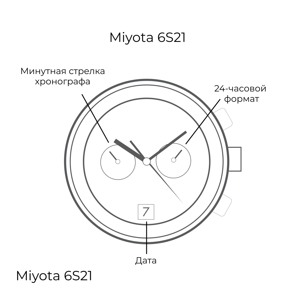 Корпус выполнен из стали, минеральное стекло с антибликом защищает циферблат от внешнего воздействия. Японский кварцевый механизм Miyota 6S21 обеспечивает точный ход и оснащен функциями времени в 12 часовом формате, секундной стрелки, даты и хронографа. Водозащита 10 bar (100 m/330 ft)* позволяет плавать в часах.