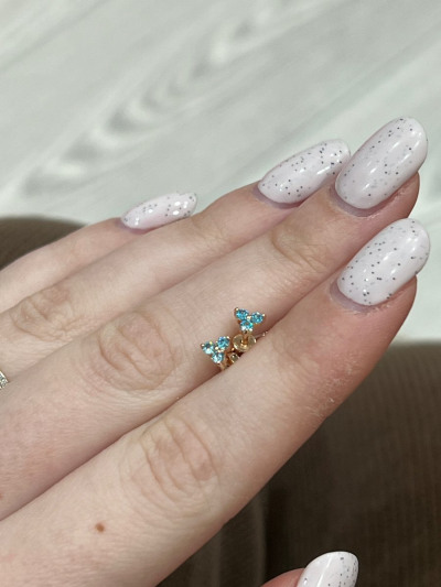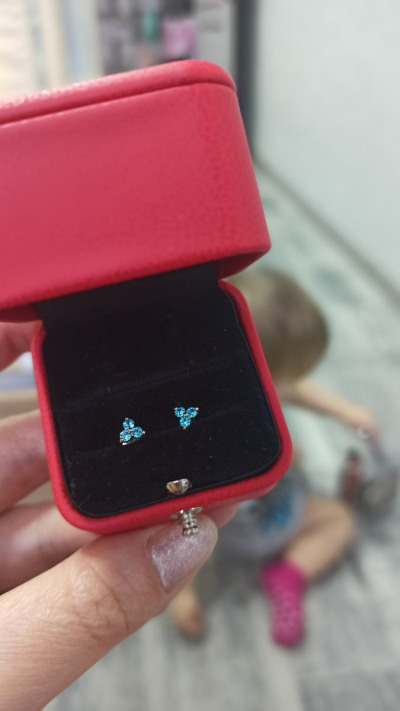 Сережки красивые, аккуратные, блестят на солнышке, взяла для дочки 1,6 года. Смущает застёжка, до этого брали гвоздики , там резьба была на половину серьги, здесь же резьба только на самом кончике, боюсь, Как бы не слетела закрутка.
