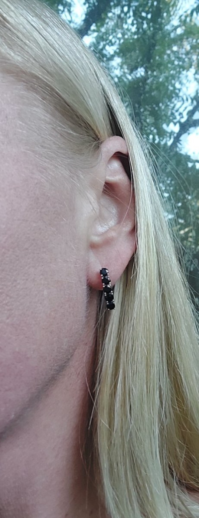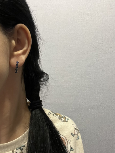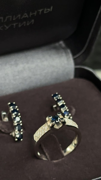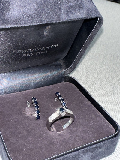 Сережки подбирала к кольцу из белого золота с сапфиром и бриллиантами. Очень понравились камни, они по размеру мне как раз подходили. Отличного цвета и прозрачности. Хороший надежный английский замок, а также отличное родирование, от белого золота не отличить. Рекомендую тем, кто любит стильные и минималистичные украшения. Смотрятся очень дорого и строго.