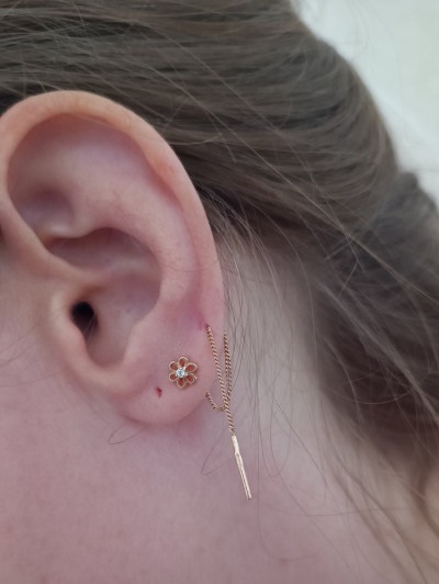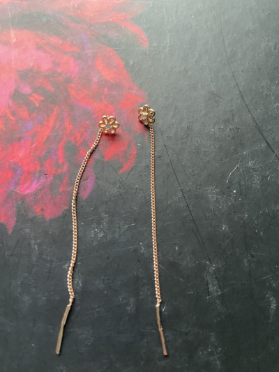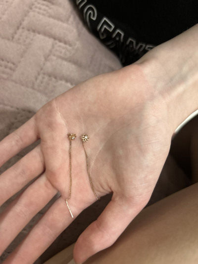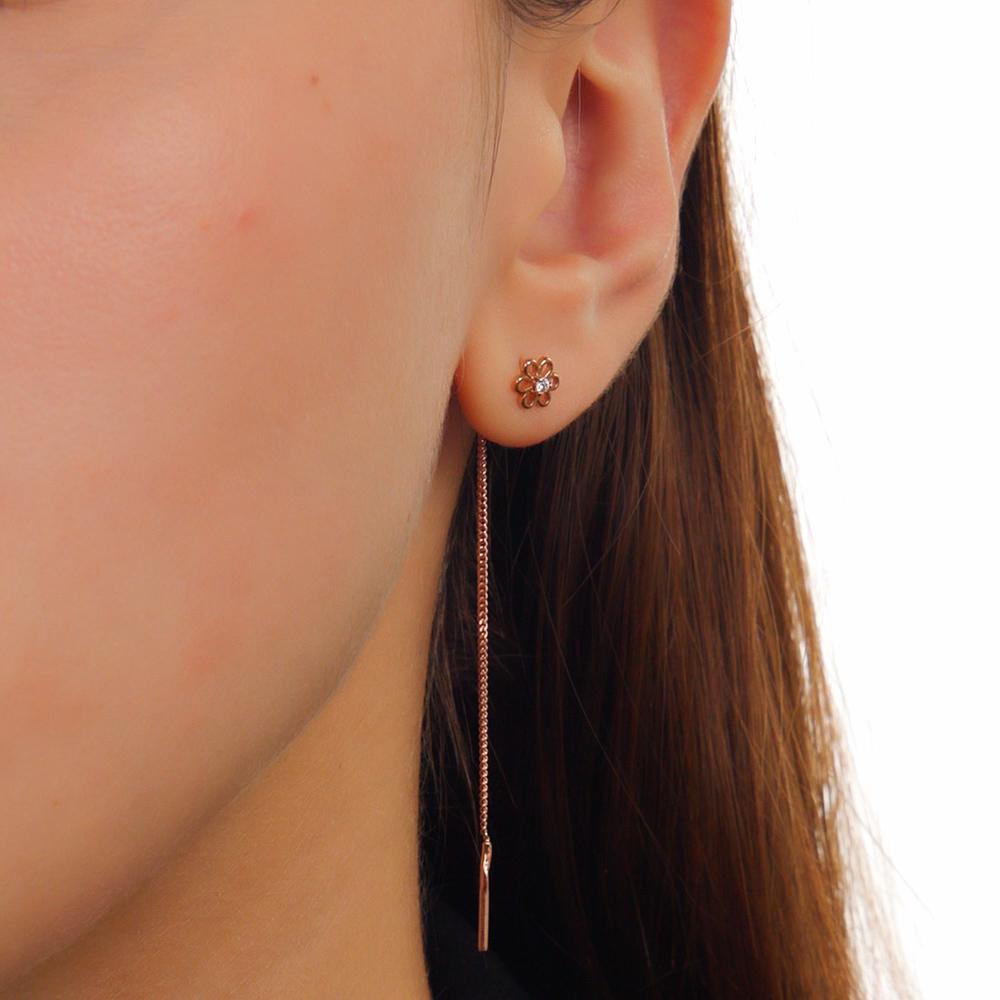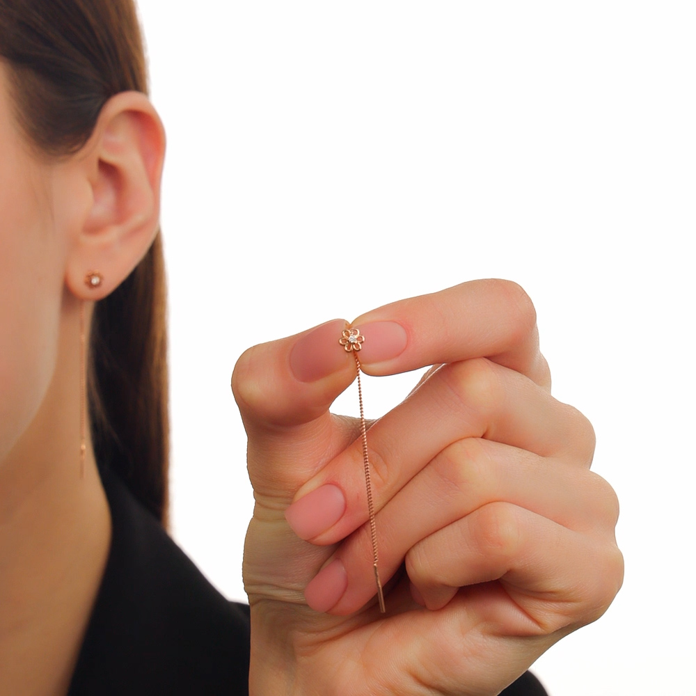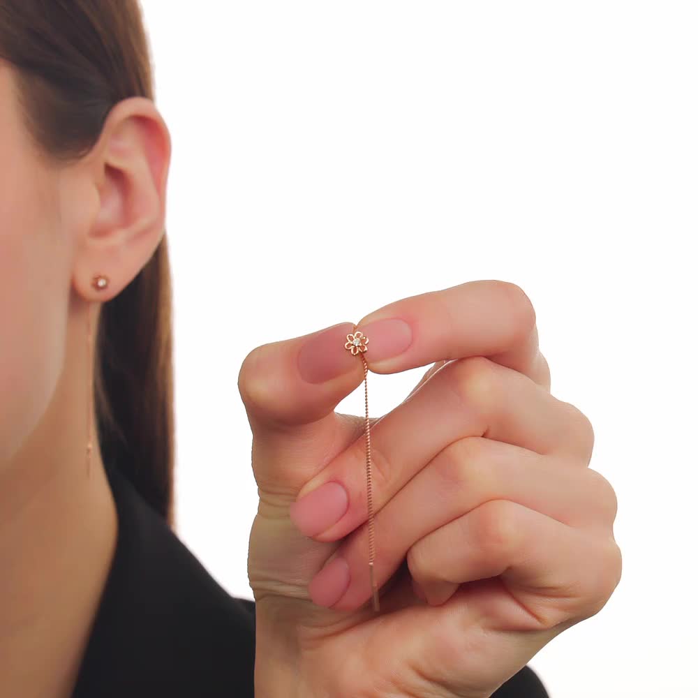 Легкие и изящные серьги-продевки, цепочка мягко ниспадает, а маленький цветок с фианитом добавляет нежности и блеска. Хороший вариант для повседневного образа, не перегружает, но придает утонченности. Удобно, если на ухе несколько дырочек.