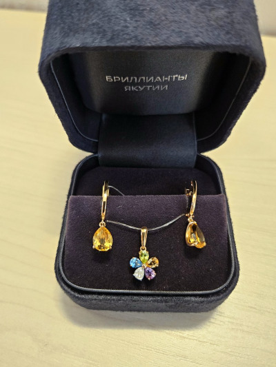 Солнечный цитрин считается символом изобилия, процветания и жизненной силы. Красивые золотые сережки с цитрином в сочетании с подвеской из миксов самоцветов - один из самых ярких летних вариантов