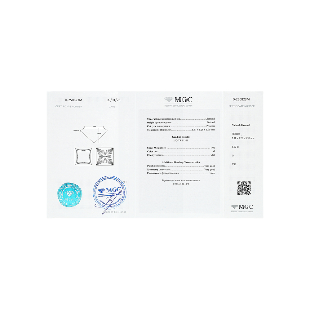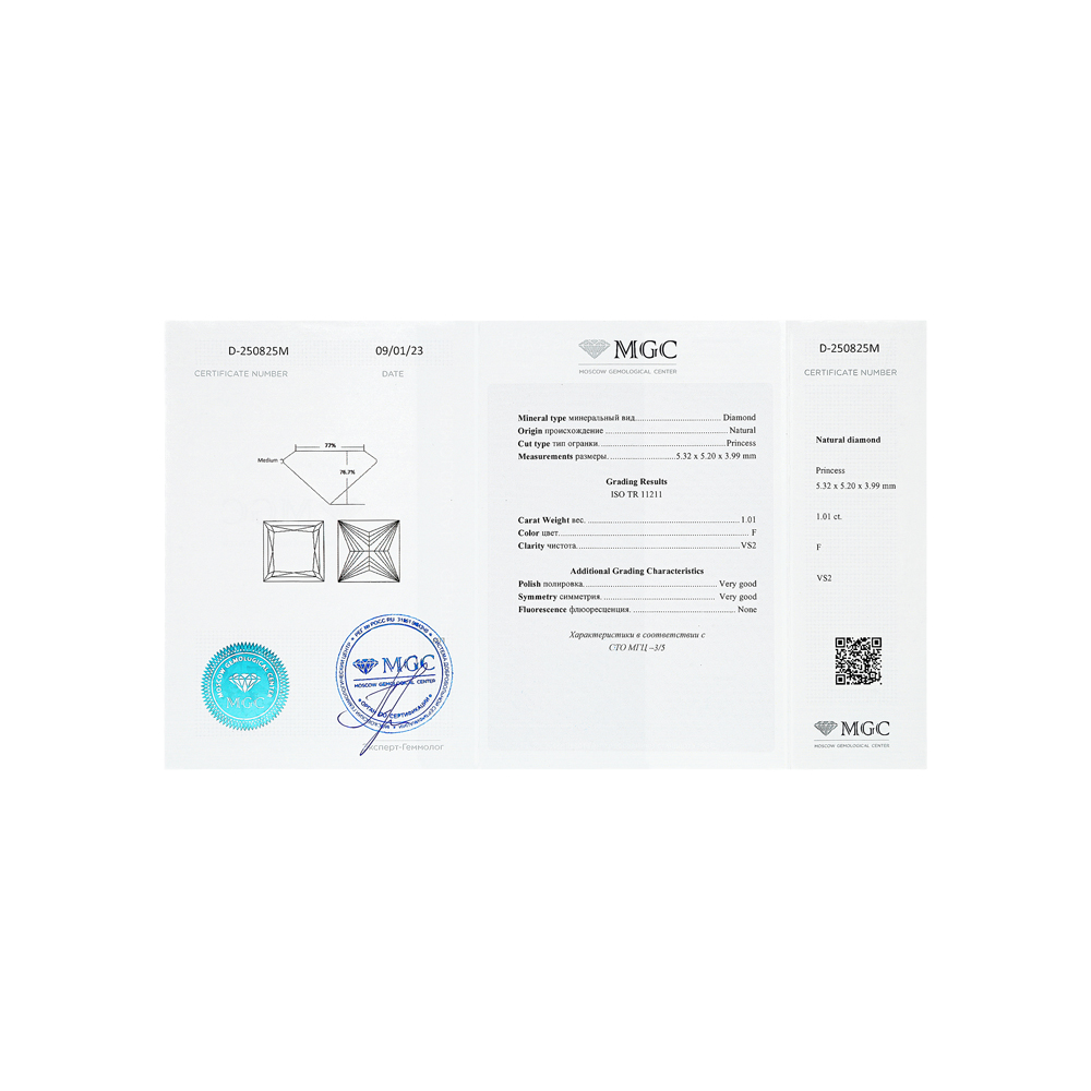 1 бриллиантом природным, 1.01 карат, огранка принцесса 65 граней, цвет 3, чистота 5, тип огранки А;