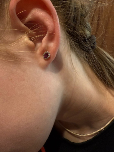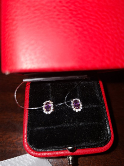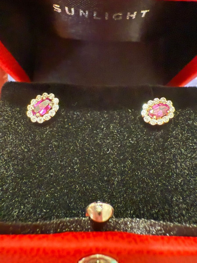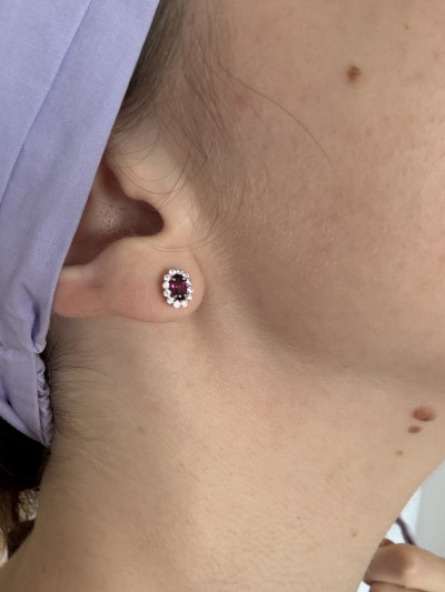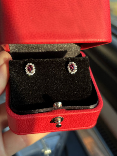 В редких случаях характеристики украшения или упаковка могут иметь отличия от представленных на фото или в описании.Серьги с 2 родолитами природными, 0.56 карат;