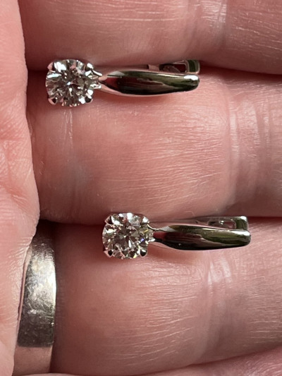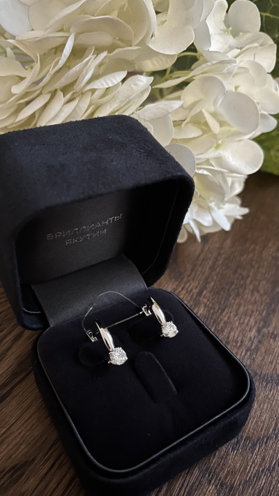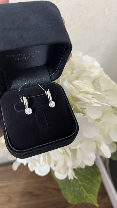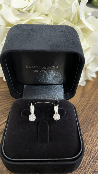 • Серьги с 2 бриллиантами выращенными, 1.06 карат, огранка круг 57 граней, цвет 4, чистота 6, тип огранки А;