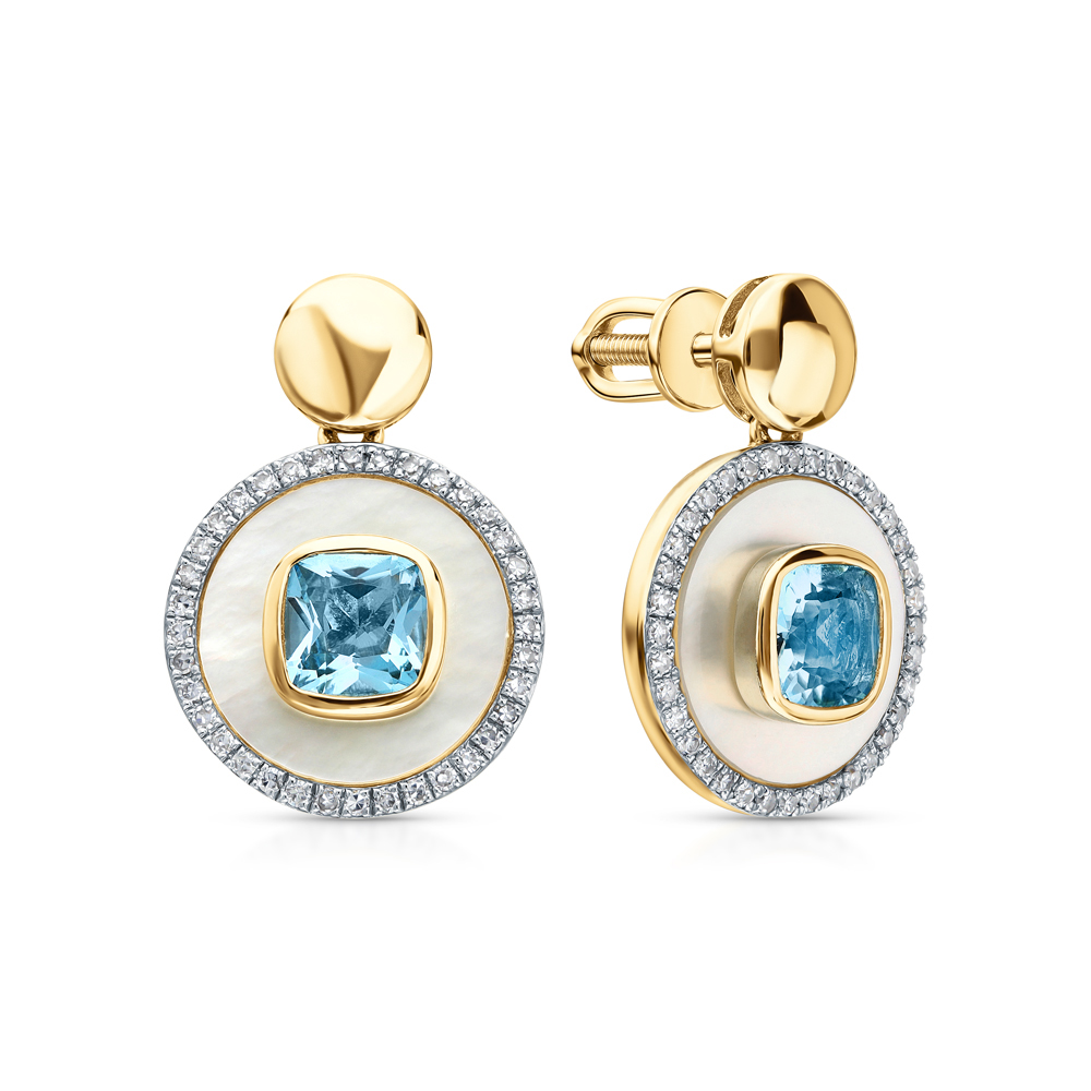 Золотые серьги с бриллиантами природными, перламутром природным и топазами природными
