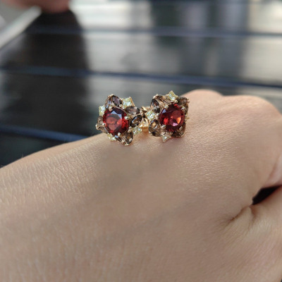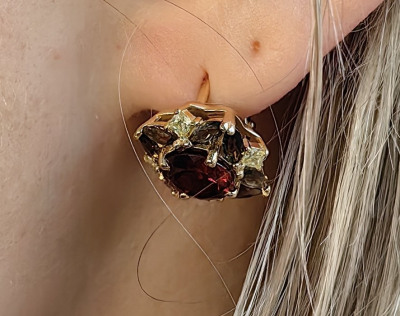 Сдержанный и благородный гранат неожиданно блеснет красным цветом как красное вино. Дымчатый кварц достойно подчеркивает гранат оттенком серого. Теплая гамма - идет кареглазым шатенкам. Пришлось откорректировать застежки в ювелирной мастерской - были велики.