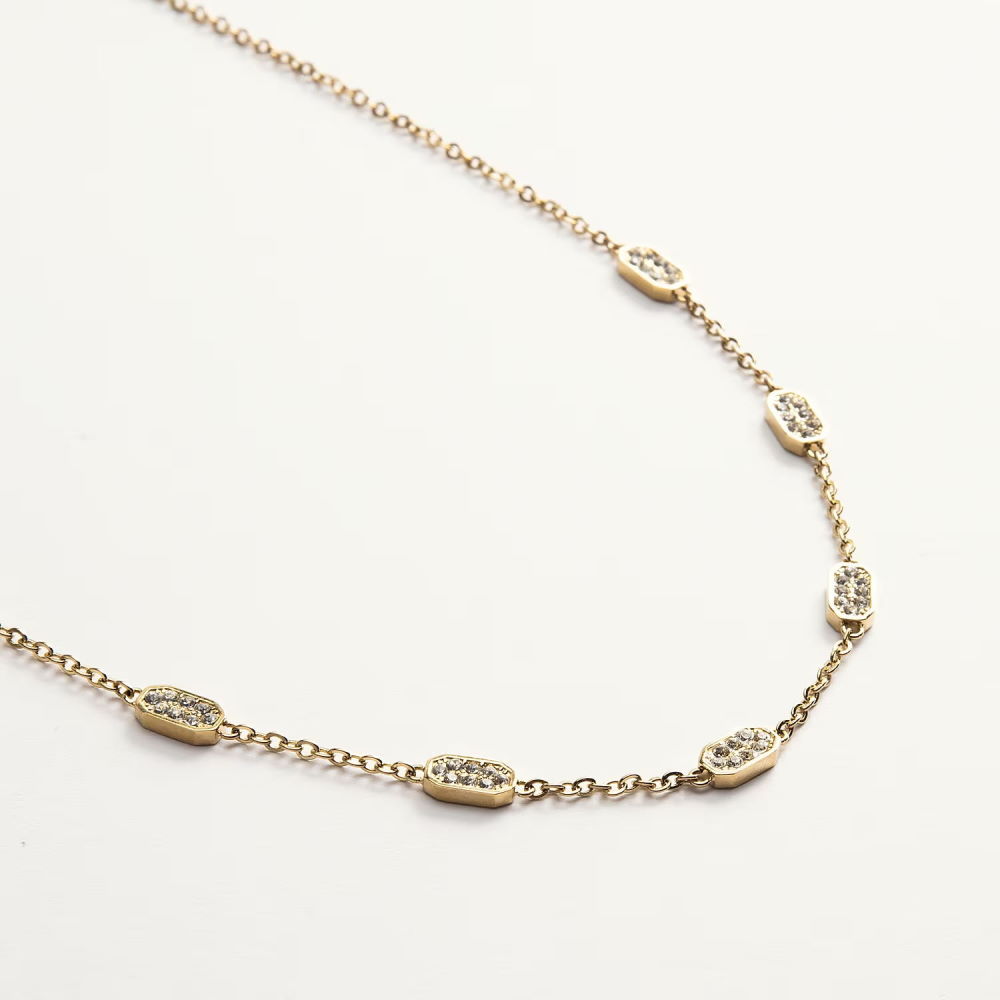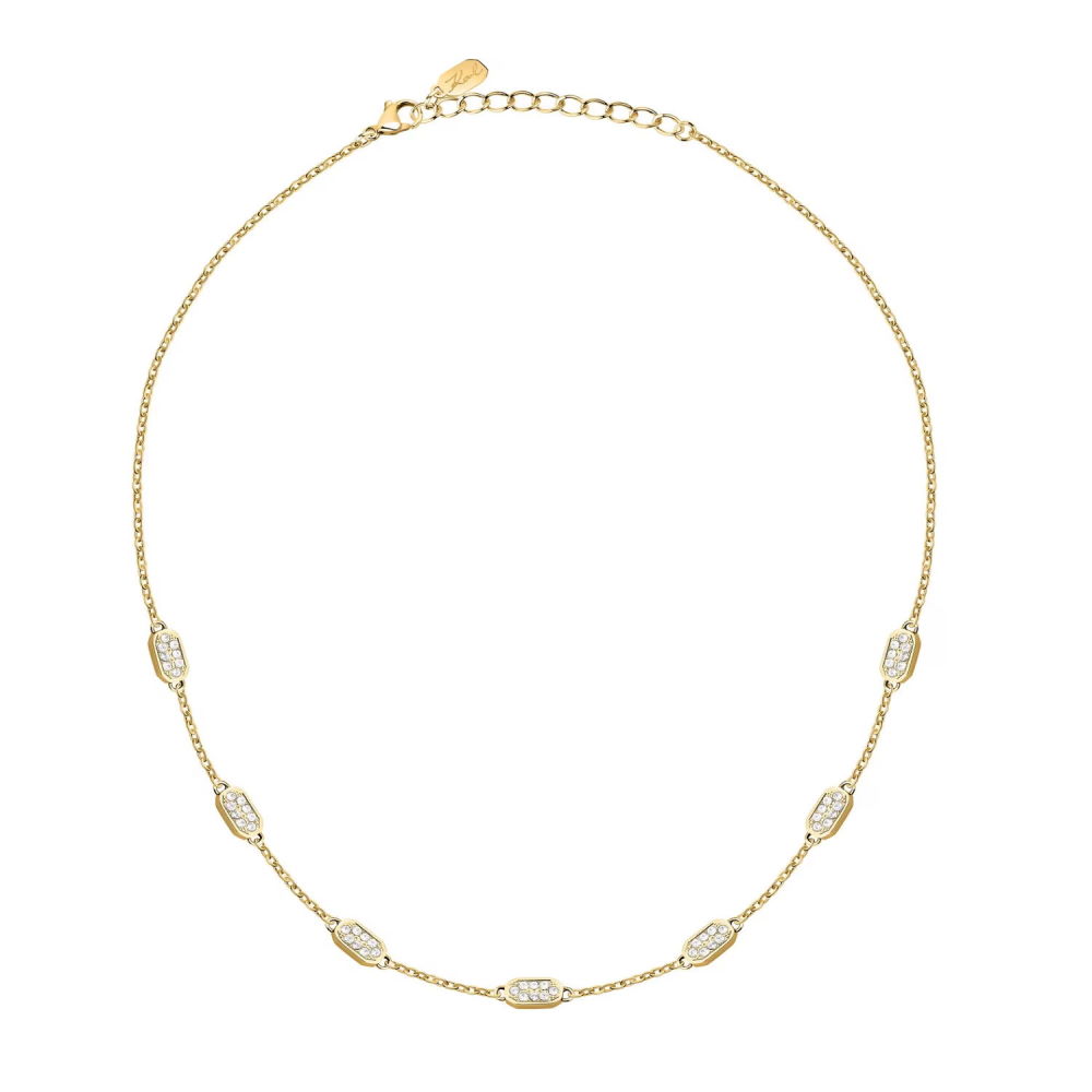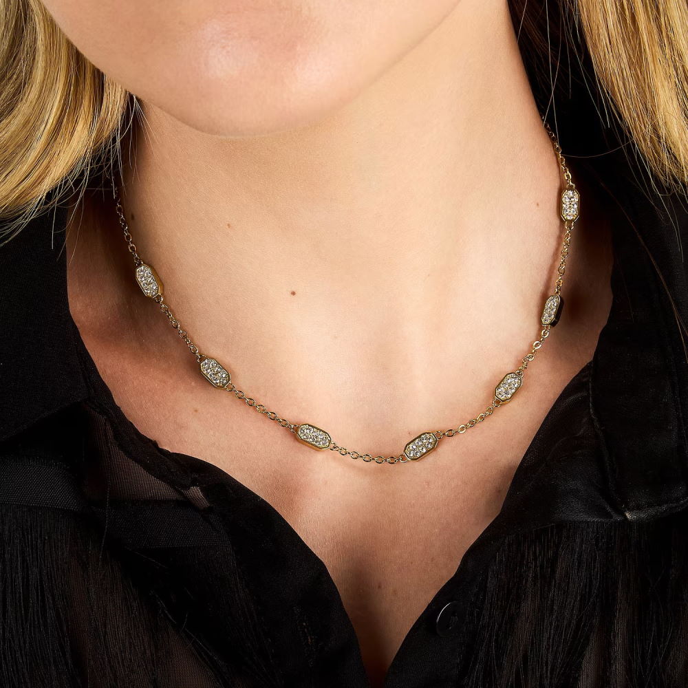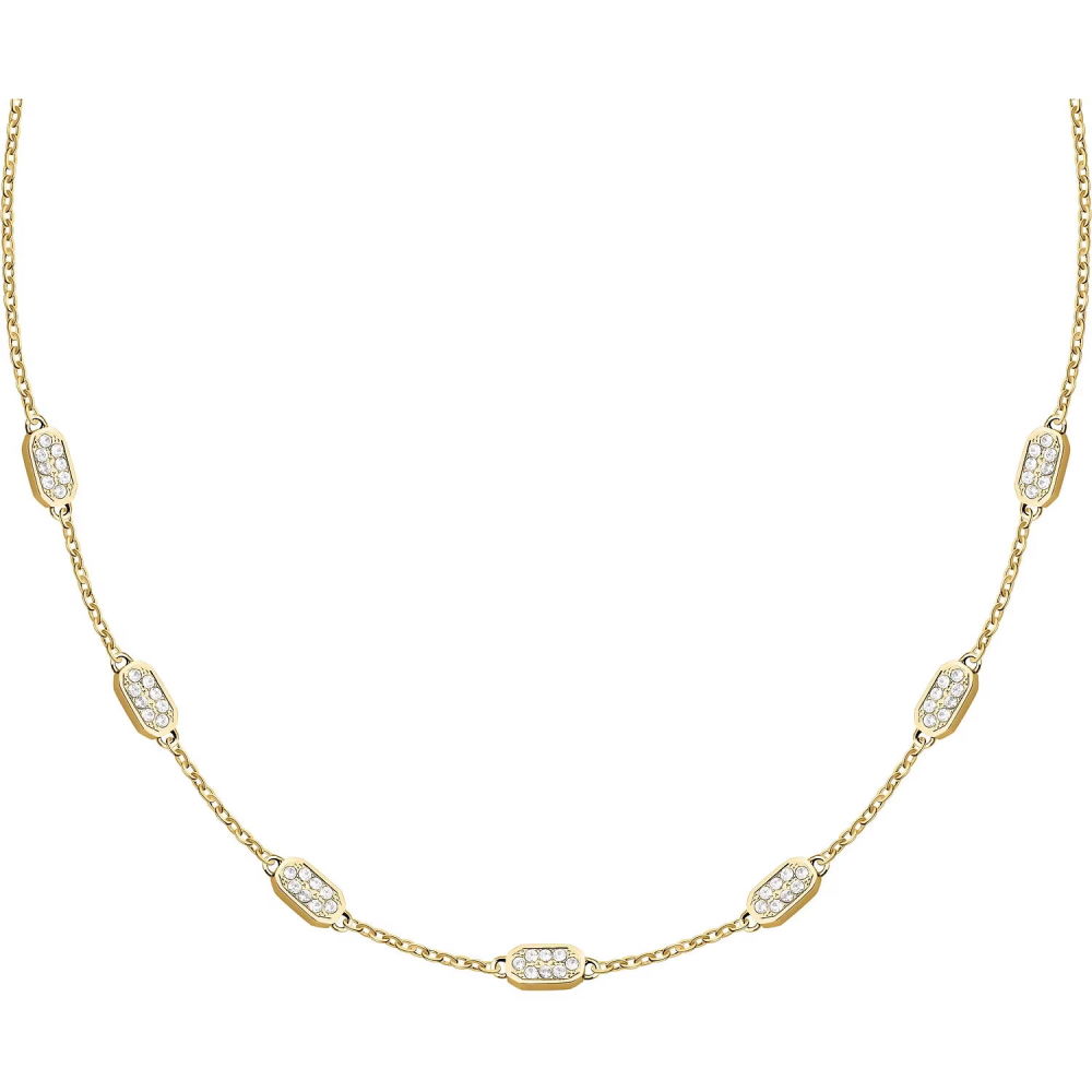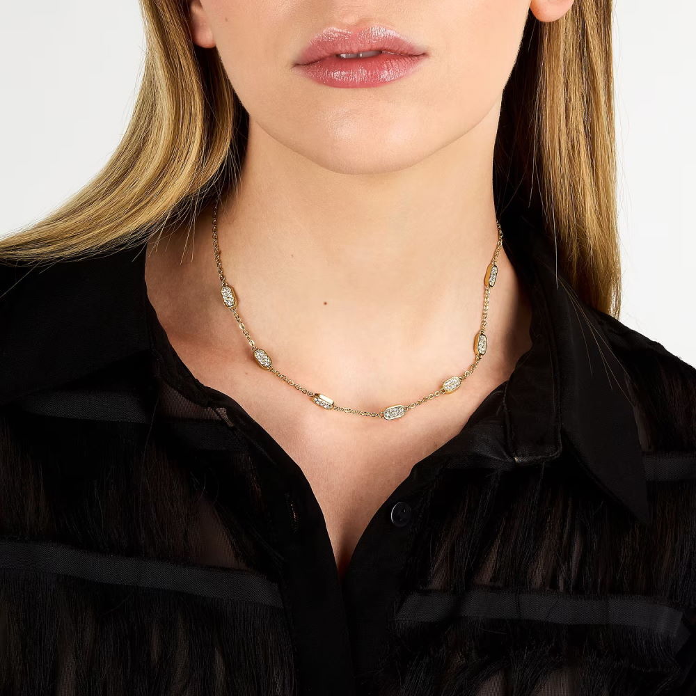 Шейное украшение из коллекции бижутерии KARL LAGERFELD Crystals. Яркий дизайн изделия: вставка из бесцветных кристаллов из стекла на стальном корпусе цвета желтое золото, переосмысливает визульные коды бренда, следуя неповторимому дерзкому стилю кутюрье. Тип застёжки: карабин. Размер изделия 40+5 см. Гарантия 14 дней.