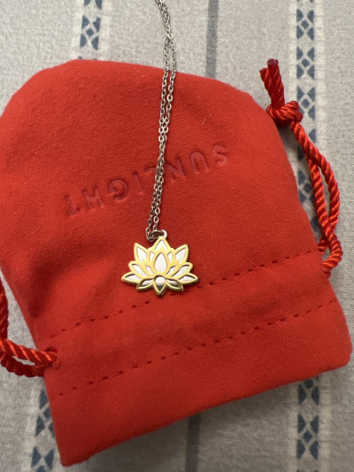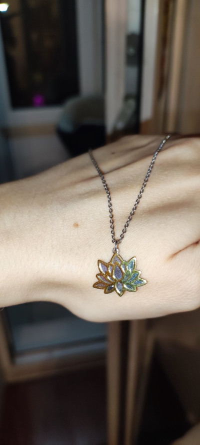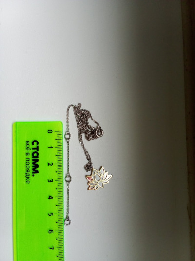 Серебряный цветок лотоса, контур выполнен позолотой, очень мило смотрится. Цепочка общей длиной 45 см с тремя колечками на конце, за которые можно застегнуть цепочку, на расстоянии примерно 2,5 см друг от друга.