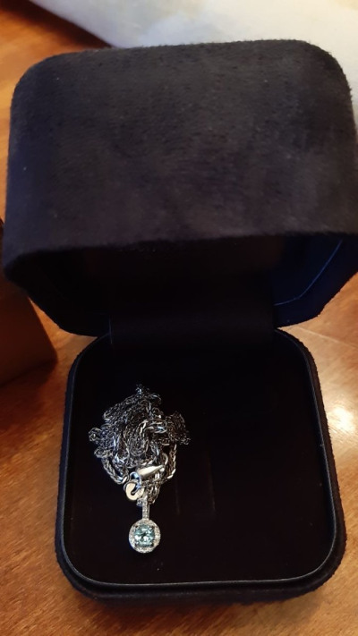 Красивая подвеска, очень хорошо подошла к цепочке из белого золота. Упаковали в прекрасную бархатную коробочку и ещё в картонную подарочную упаковку, завязали красивый бант.