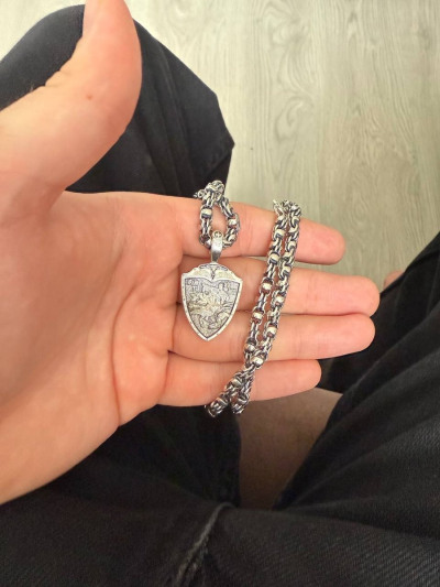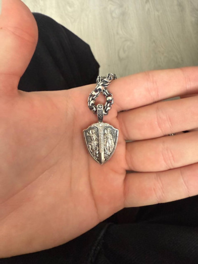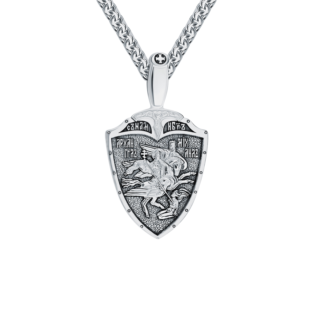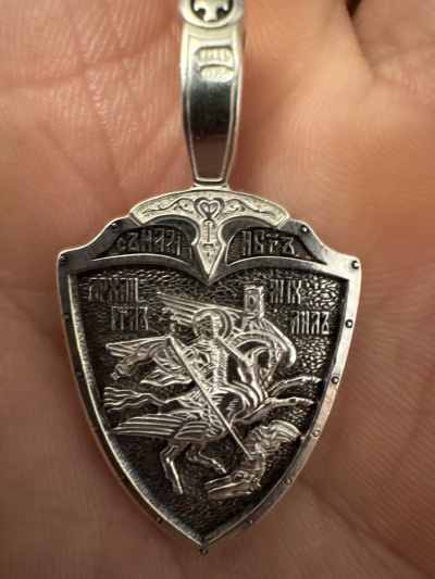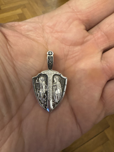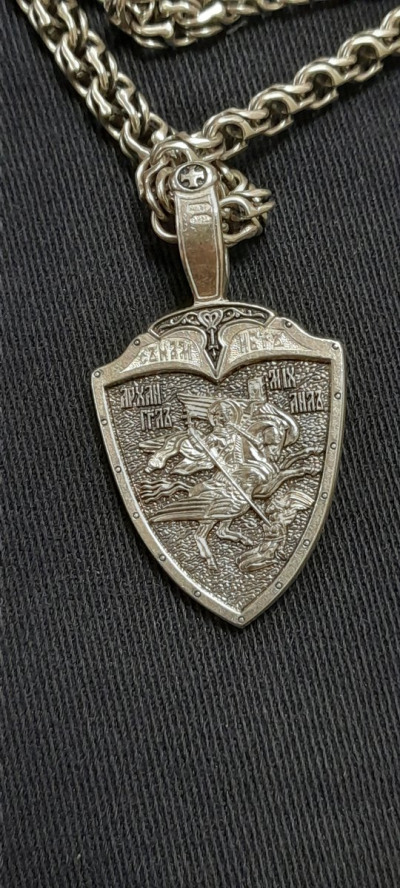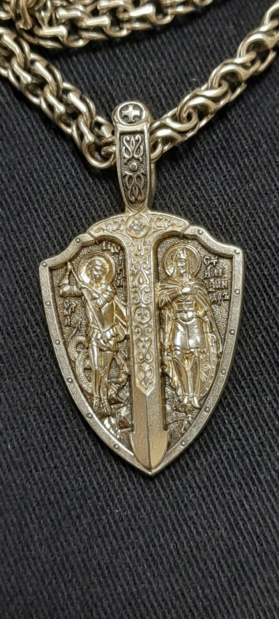 На лицевой стороне подвески изображены святые Александр Невский и Георгий Победоносец. Святой Александр Невский почитается как защитник православных христиан и покровитель воинов. Мощи святого покоятся в Александро-Невской Лавре в Петербурге. Георгий Победоносец является помощником в крестьянском труде, защитником в бедах, духовной помощью в невидимой брани с силами зла. На обороте изображён Архангел Михаил летящий на красном крылатом коне. Это образ Архангела — защитника молящегося от видимых и невидимых врагов как в земной жизни, так и после смерти.