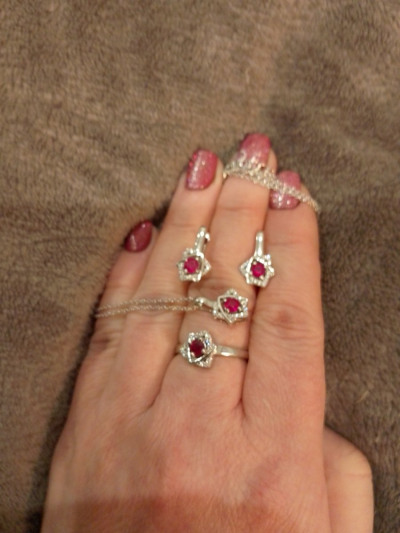 Очень понравился комплект, купила сразу с серёжками и колечком. Яркий, нарядный, рубин и фианиты сверкают