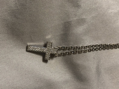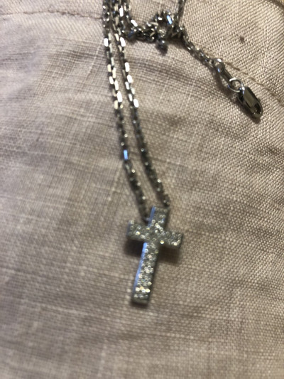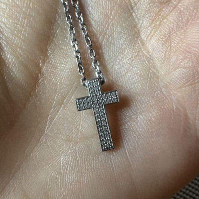Очень стильное украшение, не стандарт! Размеры 1.7 на 1см. Бриллианты маленькие, но играют хорошо за счёт огранки. Ушко для цепочки - под крестиком - редко такая конструкция бывает. Крестик не переворачивается изнаночной стороной - лежит всегда правильно. Смотрится не мелким - такой себе солидный. Рекомендую.
