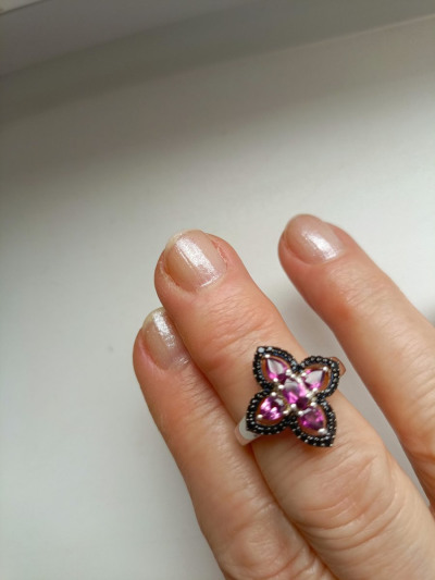 Кольцо из серебра с родолитами и шпинелью понравилось сразу в каталоге. А когда увидела вживую, то купила без раздумий. Открыла для себя новые камни - розовый родолит и черную шпинель. Очень интересное оформление без фианитов, что тоже понравилось. Кольцо хорошо располагается на пальце, не крутится. Покупку кольца советую.