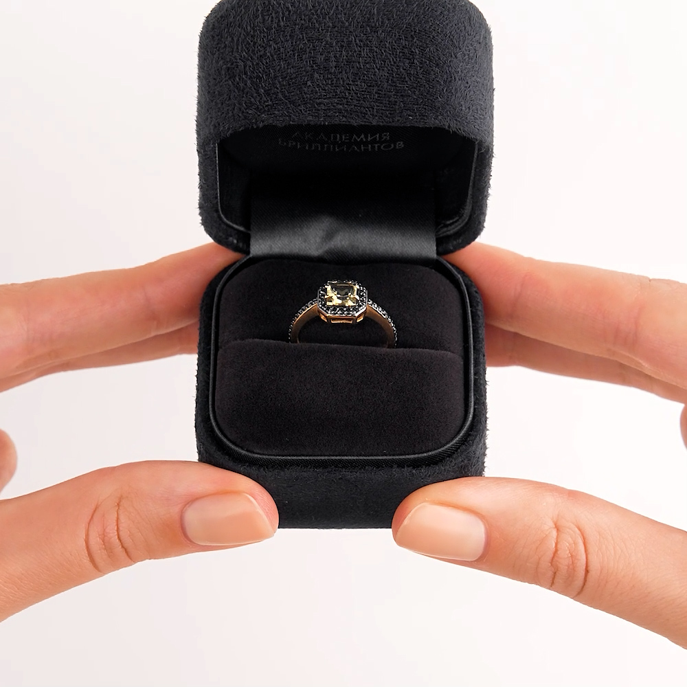 42 бриллиантами черными природными облагороженными, 0.16 карат, огранка круг 57 граней, цвет 7, чистота 6, тип огранки А;