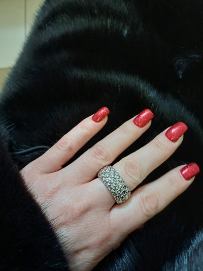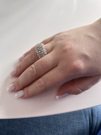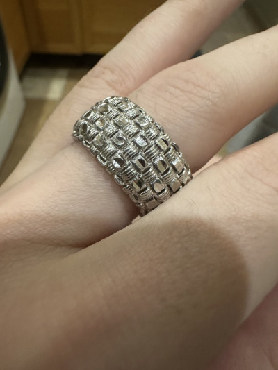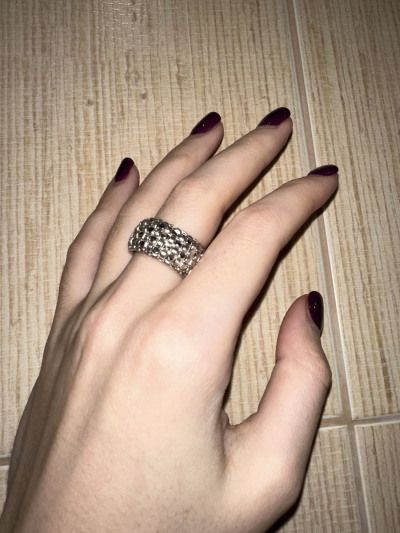 Для любителей широких колец и только на длинные пальцы. На коротких будет смотреться нелепо. Красивое, массивное, не цепляется за одежду. Привлекает взгляды. Надеюсь со временем не изменит форму.