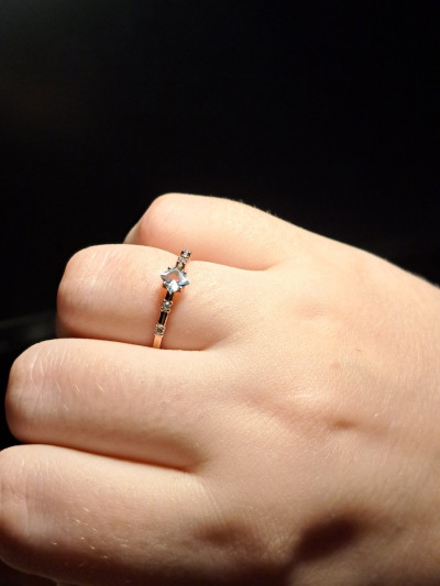 Красивое колечко, тонкое, элегантное, мило блестит. Понравилось, что фианиты и топаз очень выделяются. Как будто есть только камешки и они парят без окантовки