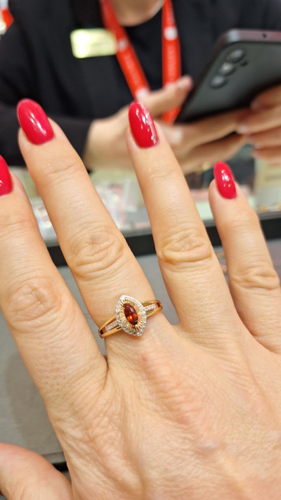Выбирала между двумя кольцами. Оба шикарные! Выбрала это, в нём камень более светлый, коньячного цвета. В прямоугольном камень тёмно-коричневый. Очень красиво играет золотое рифлёное обрамление и, конечно же, бриллиантики! Теперь хочу серьги в комплект!