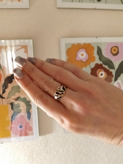 На мне кольцо 16,5 размера. Яркое, привлекает к себе внимание. Его хочется рассматривать, выглядит стильно. Очень хотела приобрести комплектом с серьгами, но не судьба, серёжки разобрали. Для полного образа купила серьги-сердечки с чёрной эмалью и кулон.