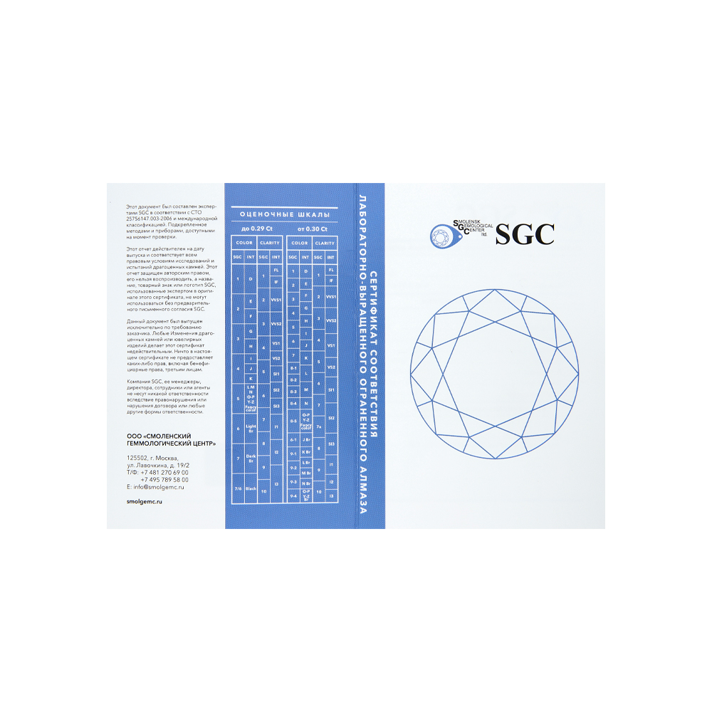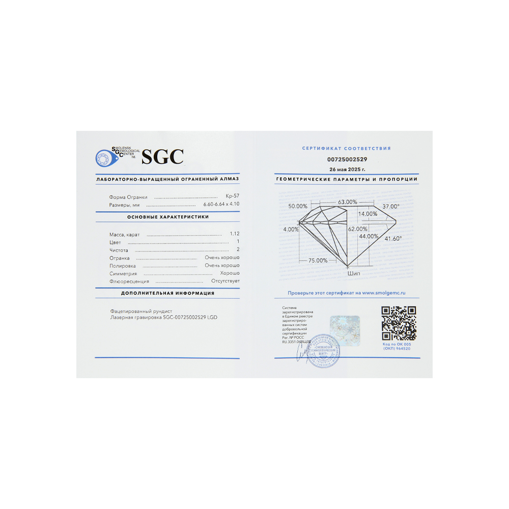 Кольцо с 1 бриллиантом выращенным, 1.05 карат, огранка круг 57 граней, цвет 3, чистота 5, тип огранки А;