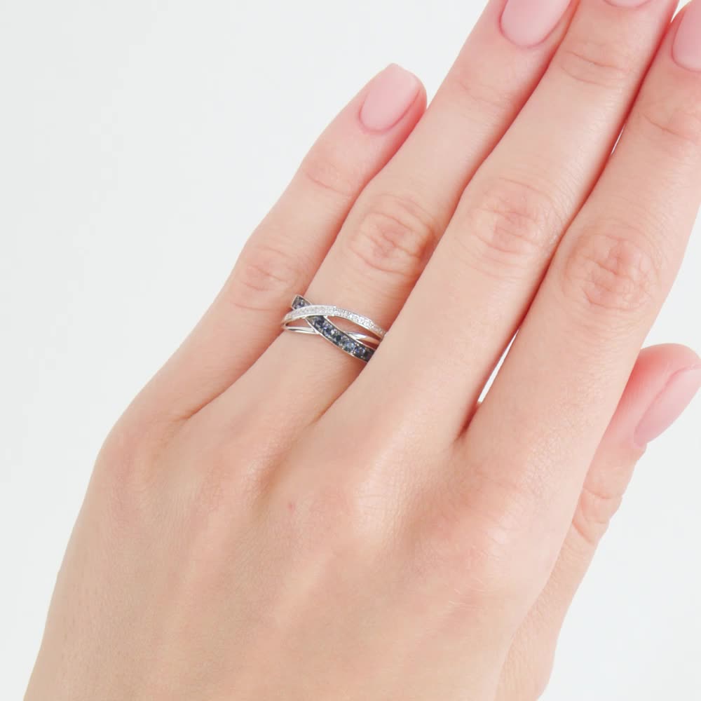 Элегантная классика в новом прочтении. Кольцо выполнено из белого золота с бриллиантами и сапфирами. Визуальный объем кольцу придают легкие, воздушные пересекающиеся линии.