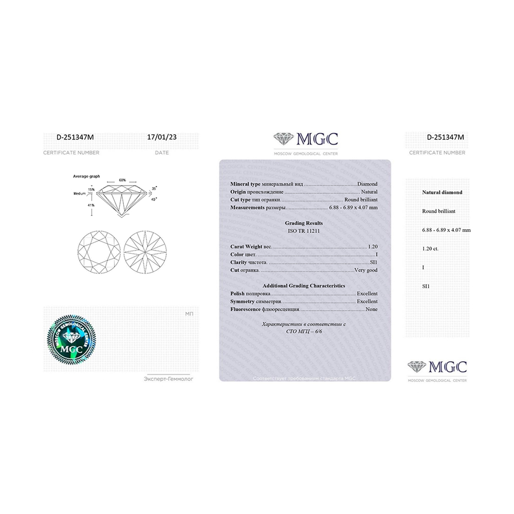 Кольцо с 1 бриллиантом природным, 1.2 карат, огранка круг 57 граней, цвет 6, чистота 6, тип огранки А;