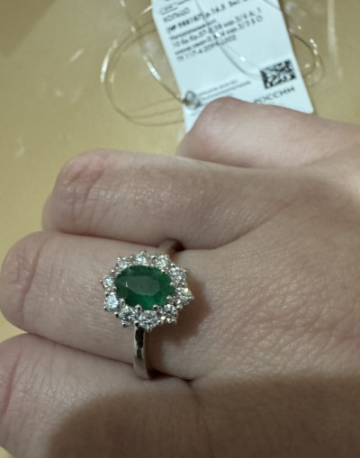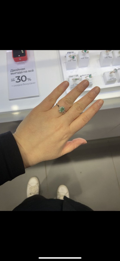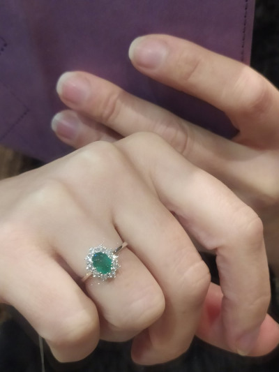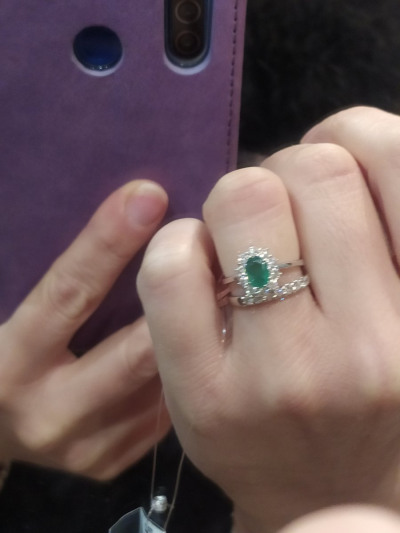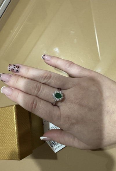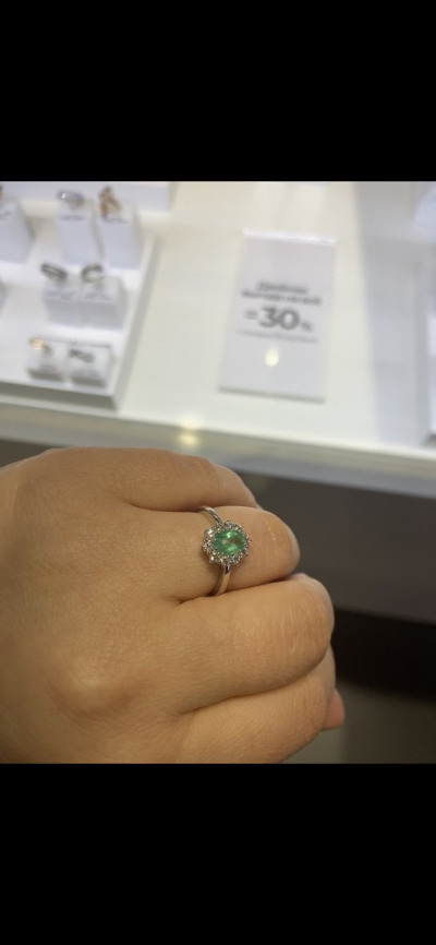 Невероятной красоты кольцо в белом золоте с изумрудом! Изумрудик светло-зелёного цвета при разном освещении цвет переливается в светло - зеленовато- голубоватый оттенок . Очень классно сочетается белое золото со светлого зелёным изумрудом! Изумруд прозрачный весь сияет, бриллианты тоже все сияют, глас не отвести. Очень игривое колечко! Я осталось в полном восторге !