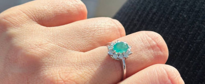 Камень яркий, но не травянистый, а цвета морской волны. Чуть в голубизну как будто. Холодный. Очень красивый! И бриллианты не крошка. Огранка 57 обратите внимание.
