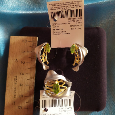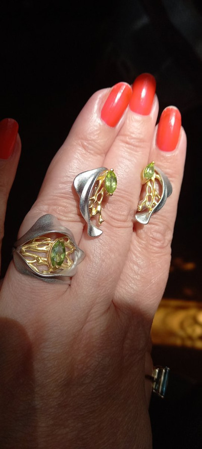 Очень понравилось. Оригинальный дизайн. Сочетание матового серебра с позолотой и яркая зелень хризолита - здесь было все прекрасно. Позолота недоступна для истирания, что тоже важно. Буду ждать когда опять появятся сережки в комплект.