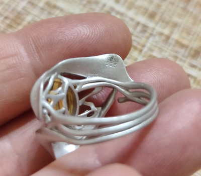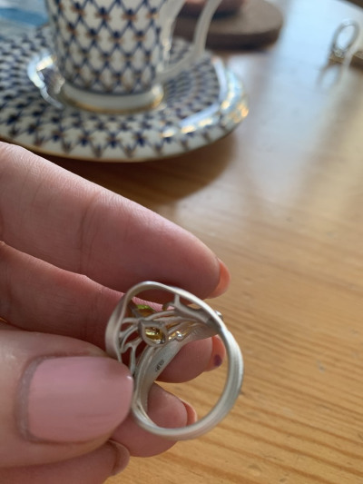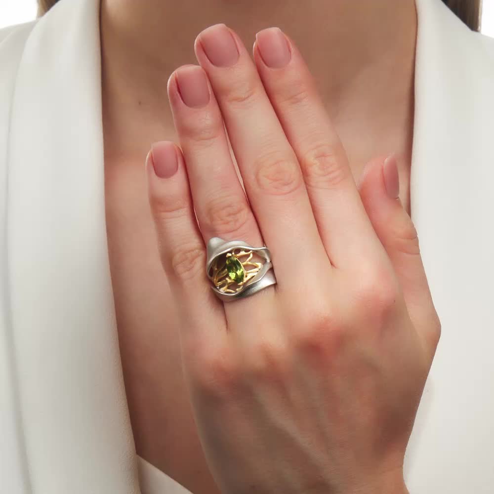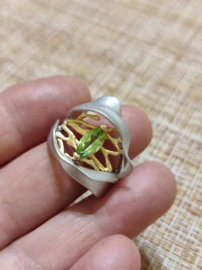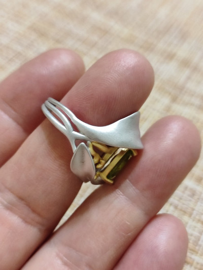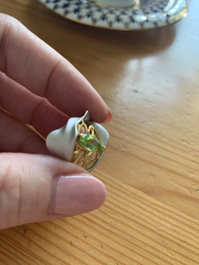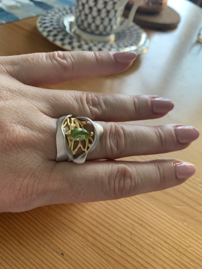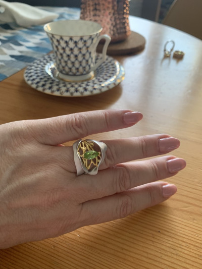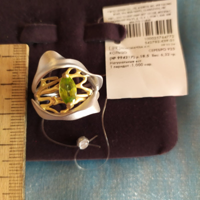 Кольцо с перидотом (хризолит). Вес 6,32гр, размер 18,5, ширина кольца 25 мм, перидот 1 карат. Необычное сочетание матового серебра и позолоты,интересный дизайн, заметное украшение. Есть серьги в комплекте. Очень понравился комплект.
