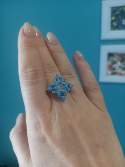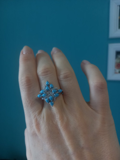 Кольцо красивое, крупное, заметное и привлекающее внимание. Хорошо сидит на пальце, не поворачивается в разные стороны. Фианиты сверкают, бирюза яркая. Здорово!